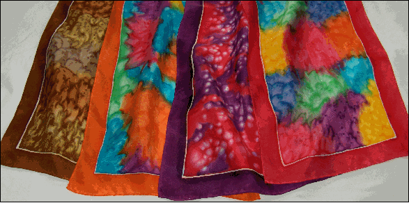 A detail of some of my work. Left to right: Chestnut Salt with Patina Bronze and Taupe, Orange Salt with Multi colours, Red and Purple Sugar, Red Salt with Multi colours. All my scarves are hand painted using steam-set water-based dyes. Prices start at $35.00 Cdn.