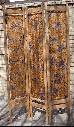 "THREE PANEL SCREEN, BROWN SALT" Soft Brown, Caramel and Gold patches with salt. Frame is red oak finished with tung oil and a hand rubbed paste wax. Panels are 15" x 72" $300.00 Cdn.